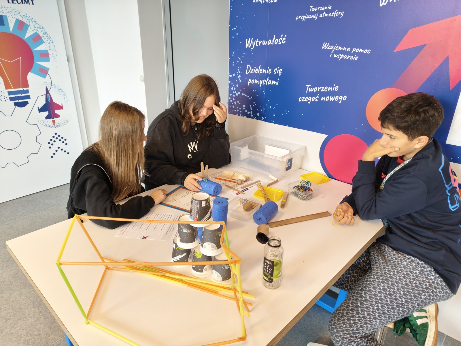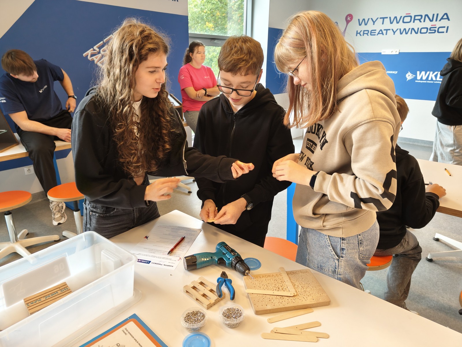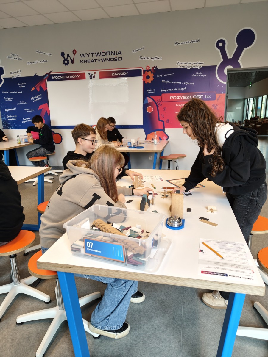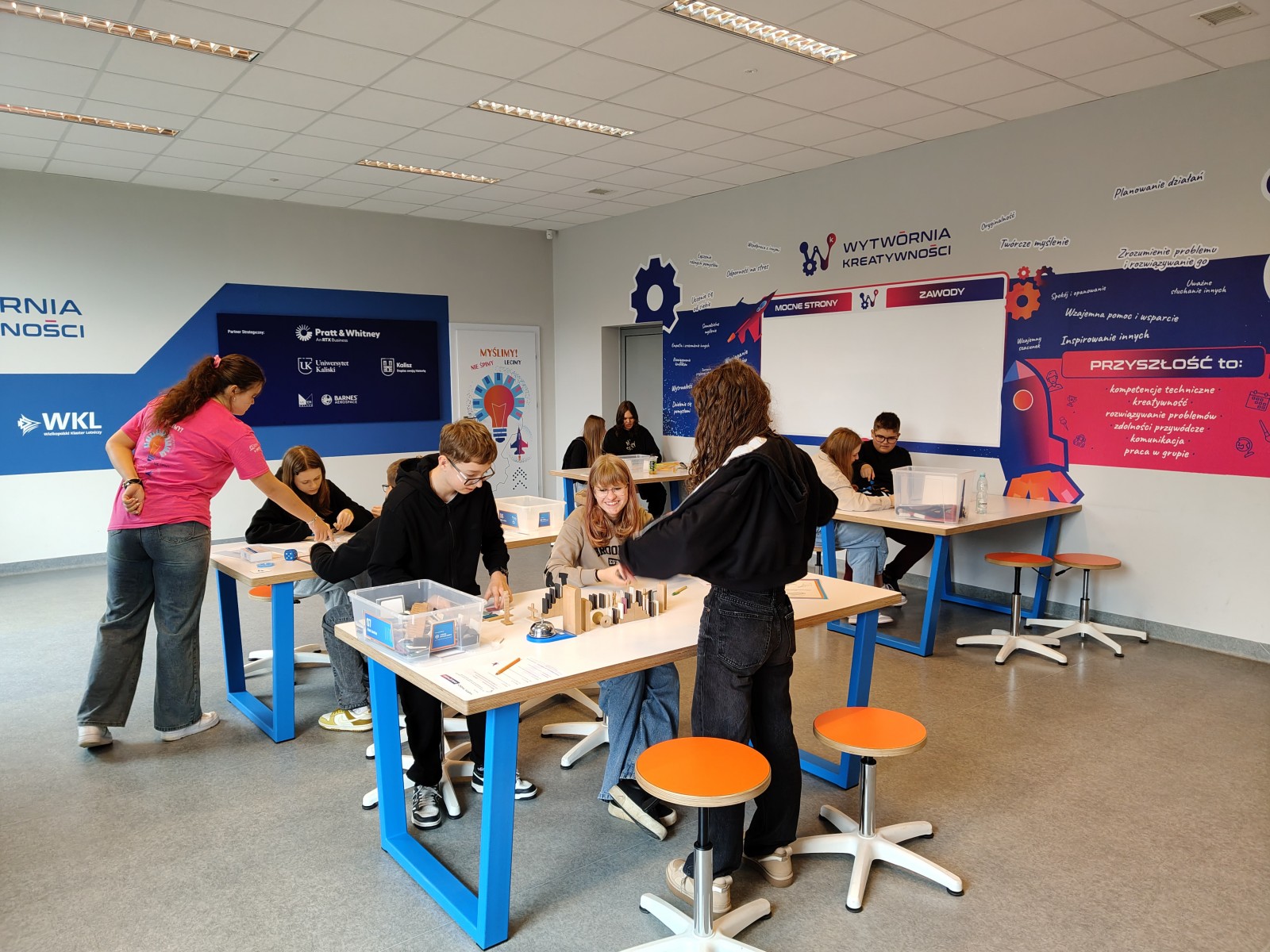 6 października klasa 7a wzięła udział w warsztatach w Wytwórni Kreatywności na terenie Uniwersytetu Kaliskiego na Wydziale Politechniki. Uczniowie mieli rozwiązać zadania i przeprowadzić techniczne eksperymenty współpracując w grupach, gdzie kształtowali kompetencje miękkie, takie jak: współpraca z innymi, wytrwałość, łączenie różnych pomysłów, uważne słuchanie, czy tworzenie przyjaznej atmosfery. Podczas podsumowania uczestnicy warsztatów mieli okazję zastanowić się, jak wspomniane kompetencje można wykorzystać w różnych zawodach. Na pewno wrócimy na kolejną edycję w przyszłym roku.