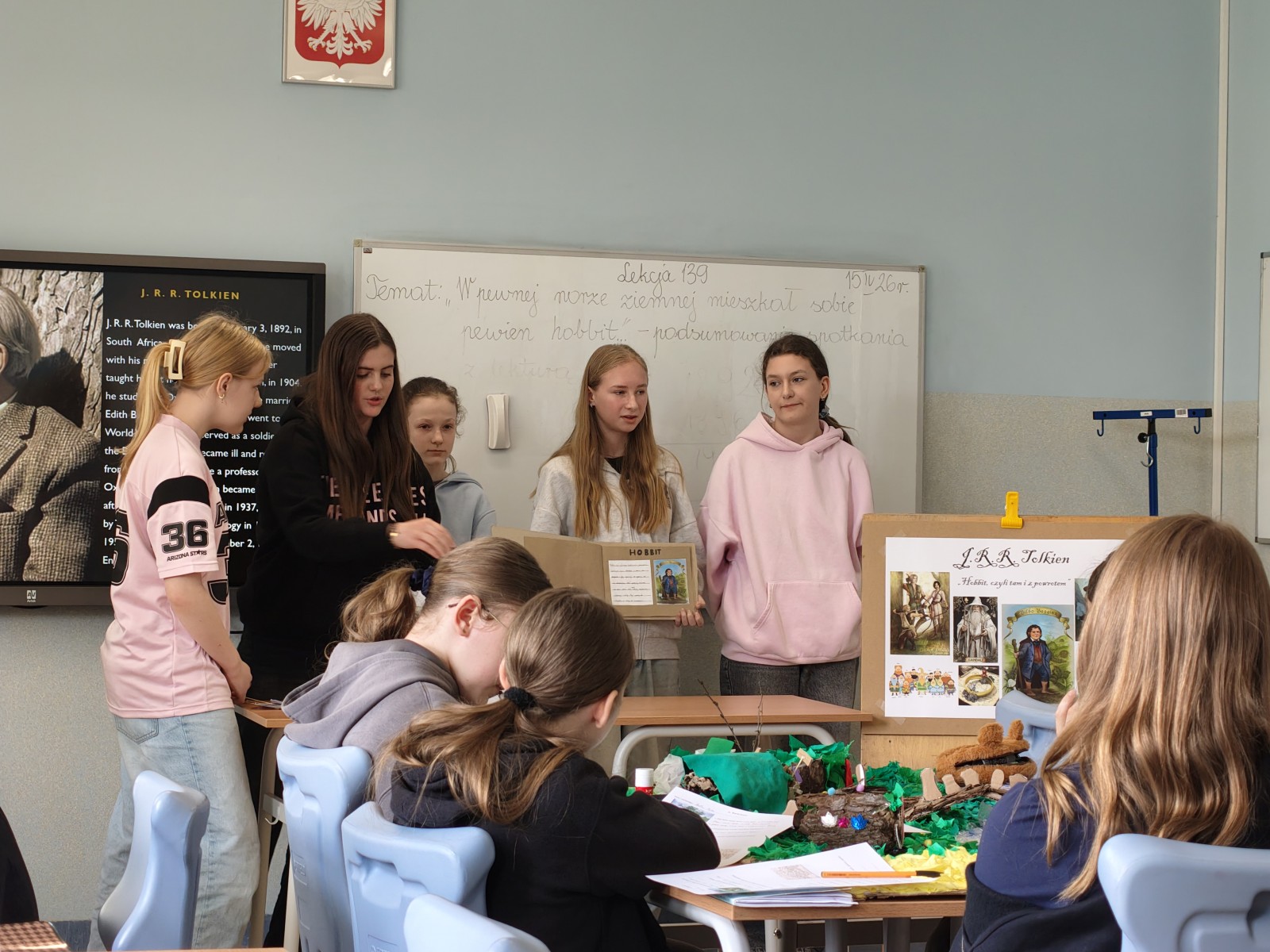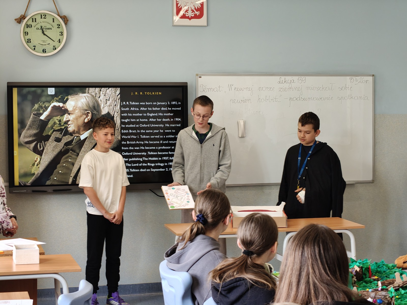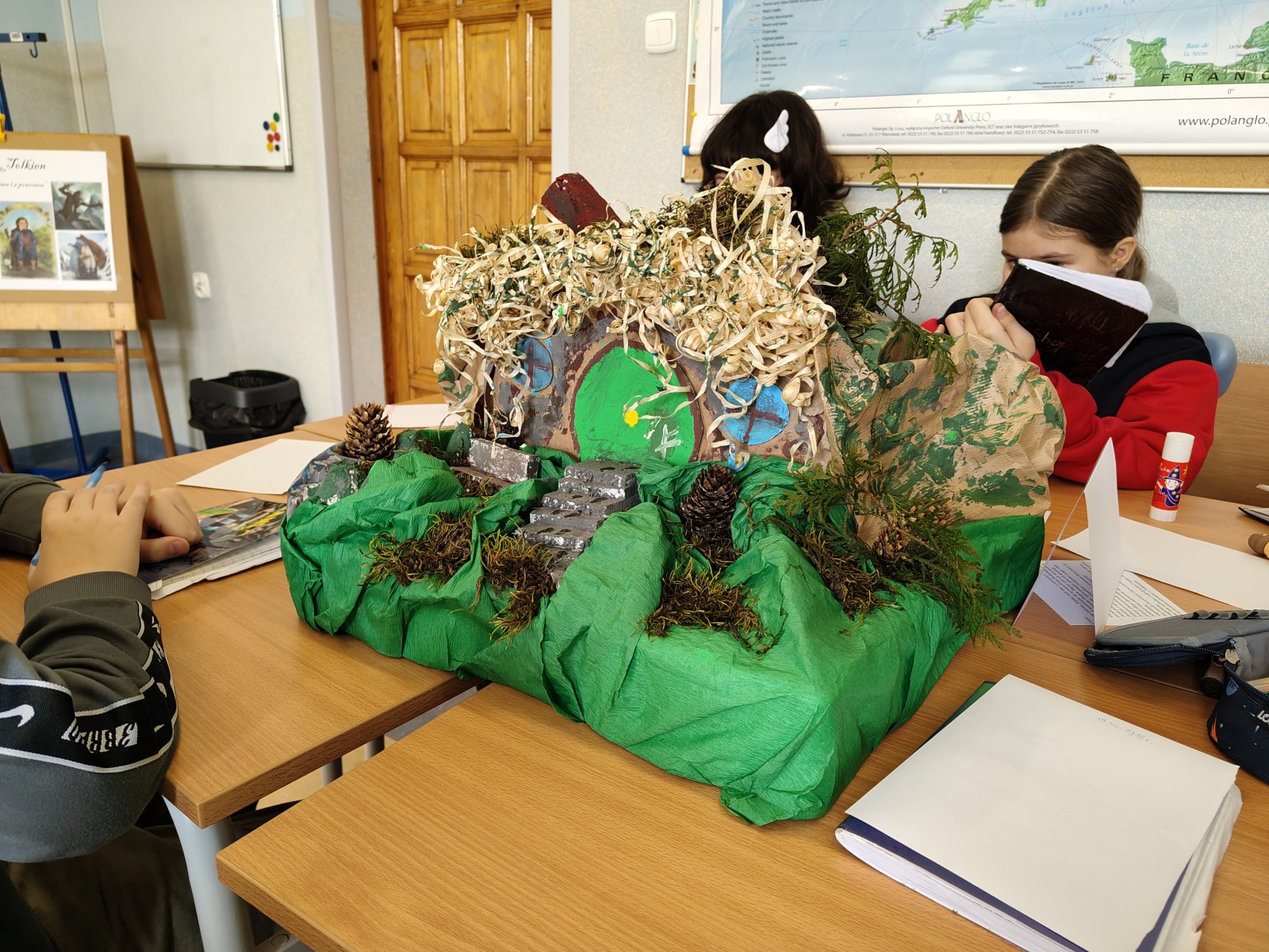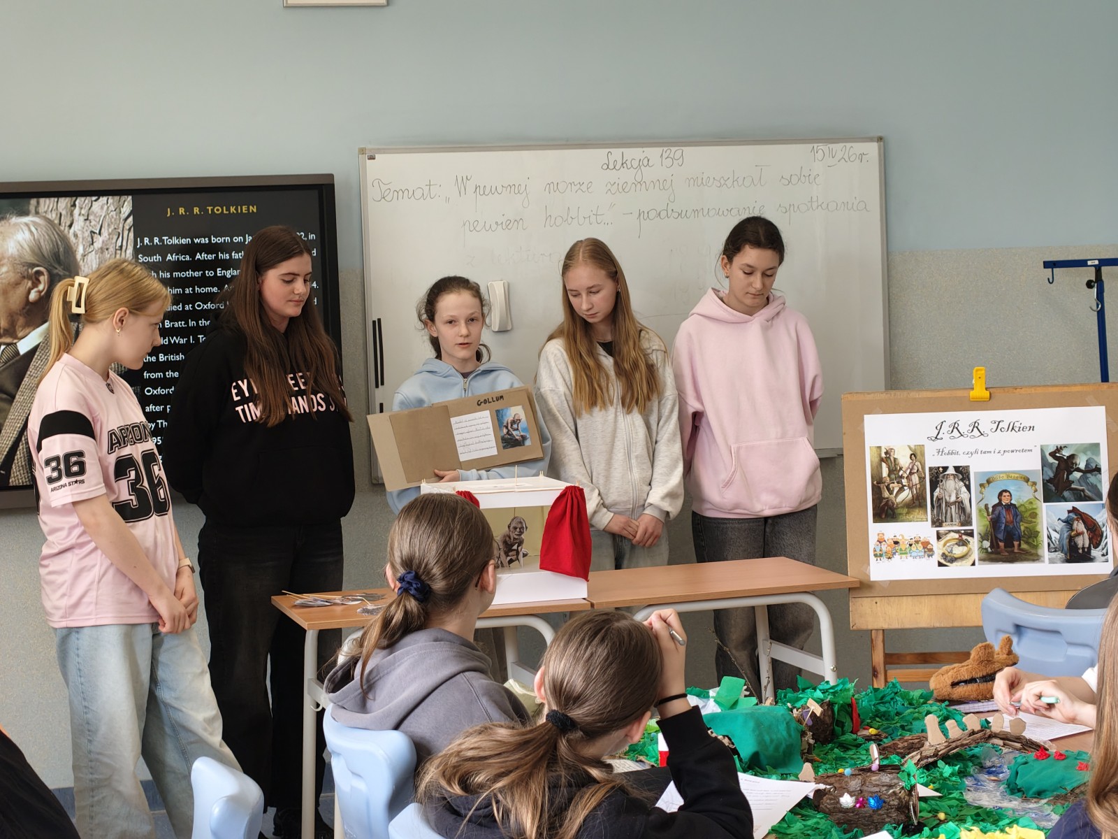 Uczniowie w grupach przygotowali projekty: norka Bilbo Bagginsa, makieta Hobbitonu, gra na podstawie lektury, makieta trasy wędrowców przez Śródziemie po Arcyklejnot, przedstawienie wybranych bohaterów z lektury "Hobbit, czyli tam i z powrotem".