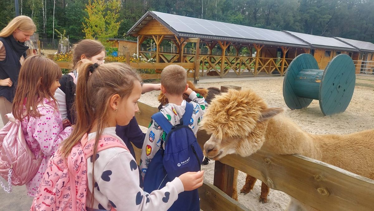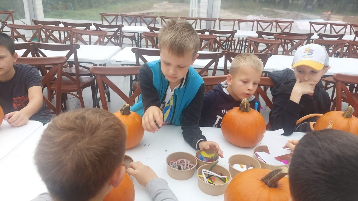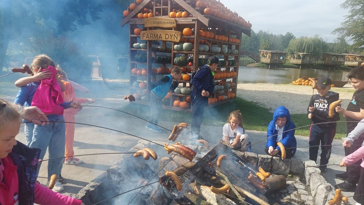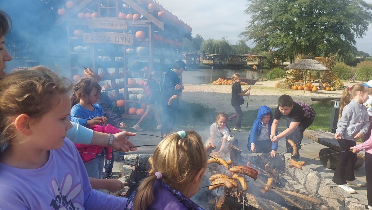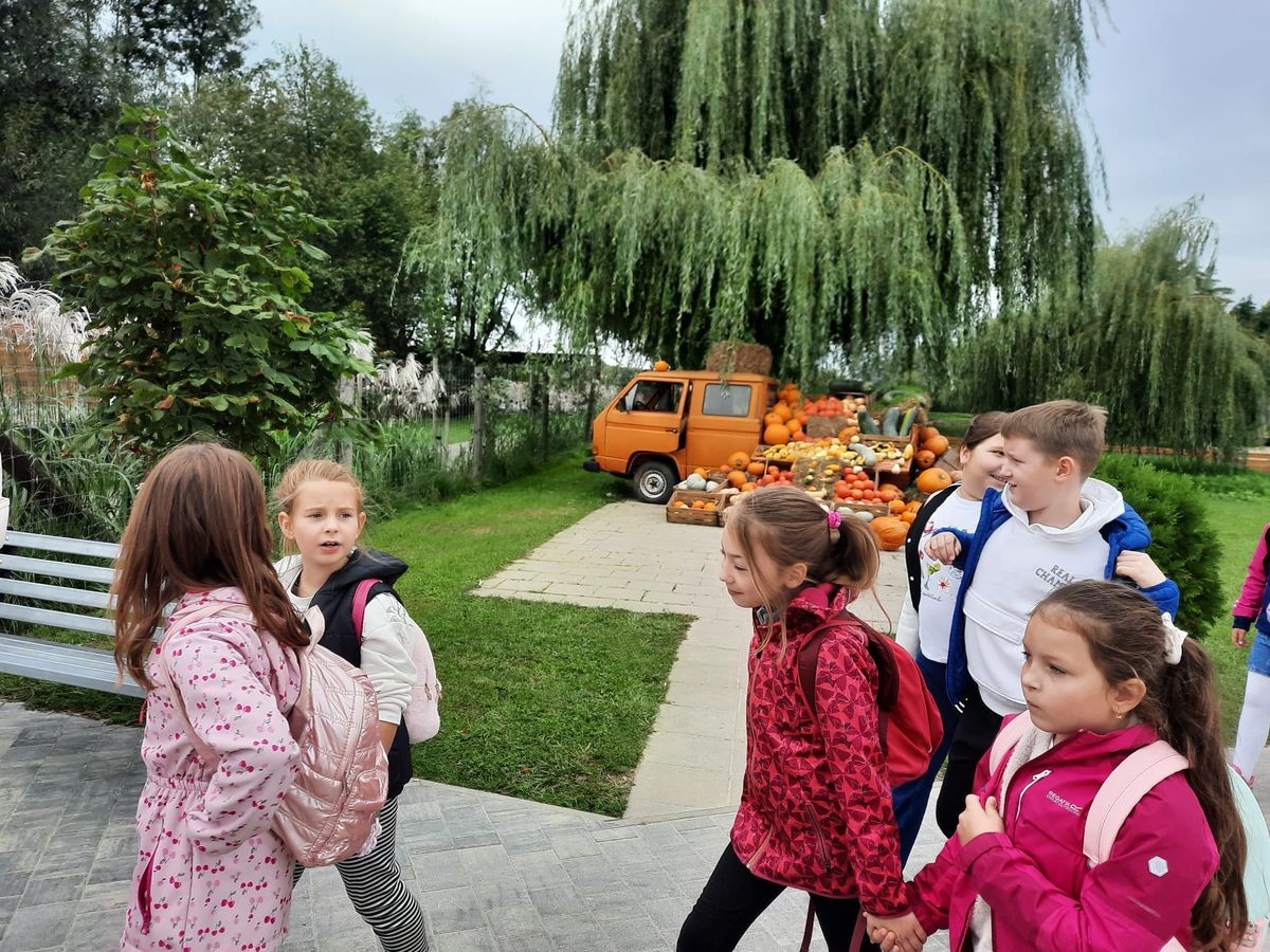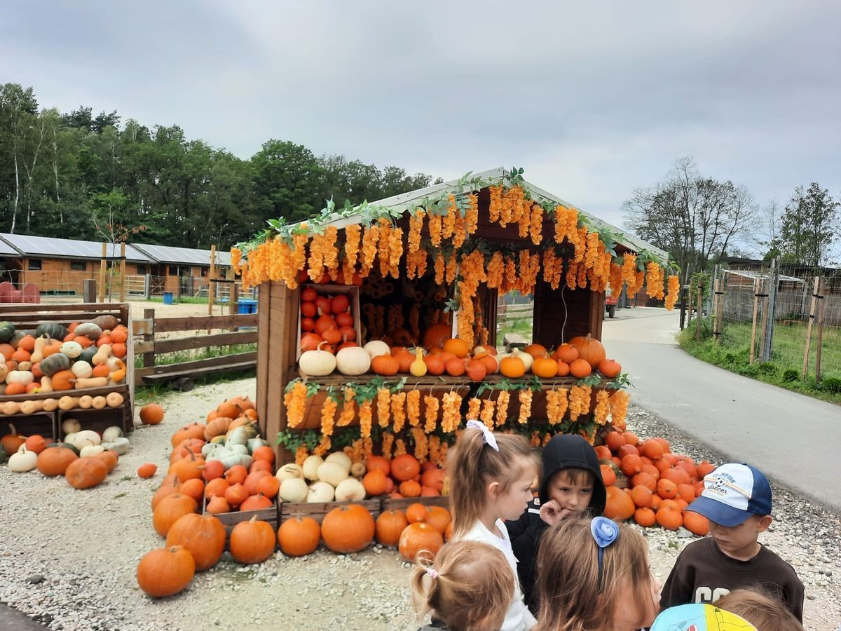 Miejsce zachwycało pięknem kolorów i form, wśród których dominowały dynie. Dzieci bardzo miło spędziły czas na świeżym powietrzu, gdzie spotkały wiele zwierząt, takich jak: wielbłądy, kangury, osły, kozy wietnamskie, króliki, alpaki. Po spacerze z przewodnikiem i karmieniu zwierząt odbyły się warsztaty zdobienia dyni. Dzieci uruchomiły swoją wyobraźnię i stworzyły rozmaite formy. Na pękatych kształtach pomarańczowych kul malowały, naklejały i rzeźbiły.nDzieci wróciły do domów ze swoimi dyniami w atmosferze radości. Kolejny raz miały okazję integrować się i bawić poza terenem szkoły.