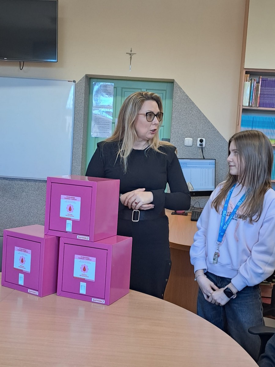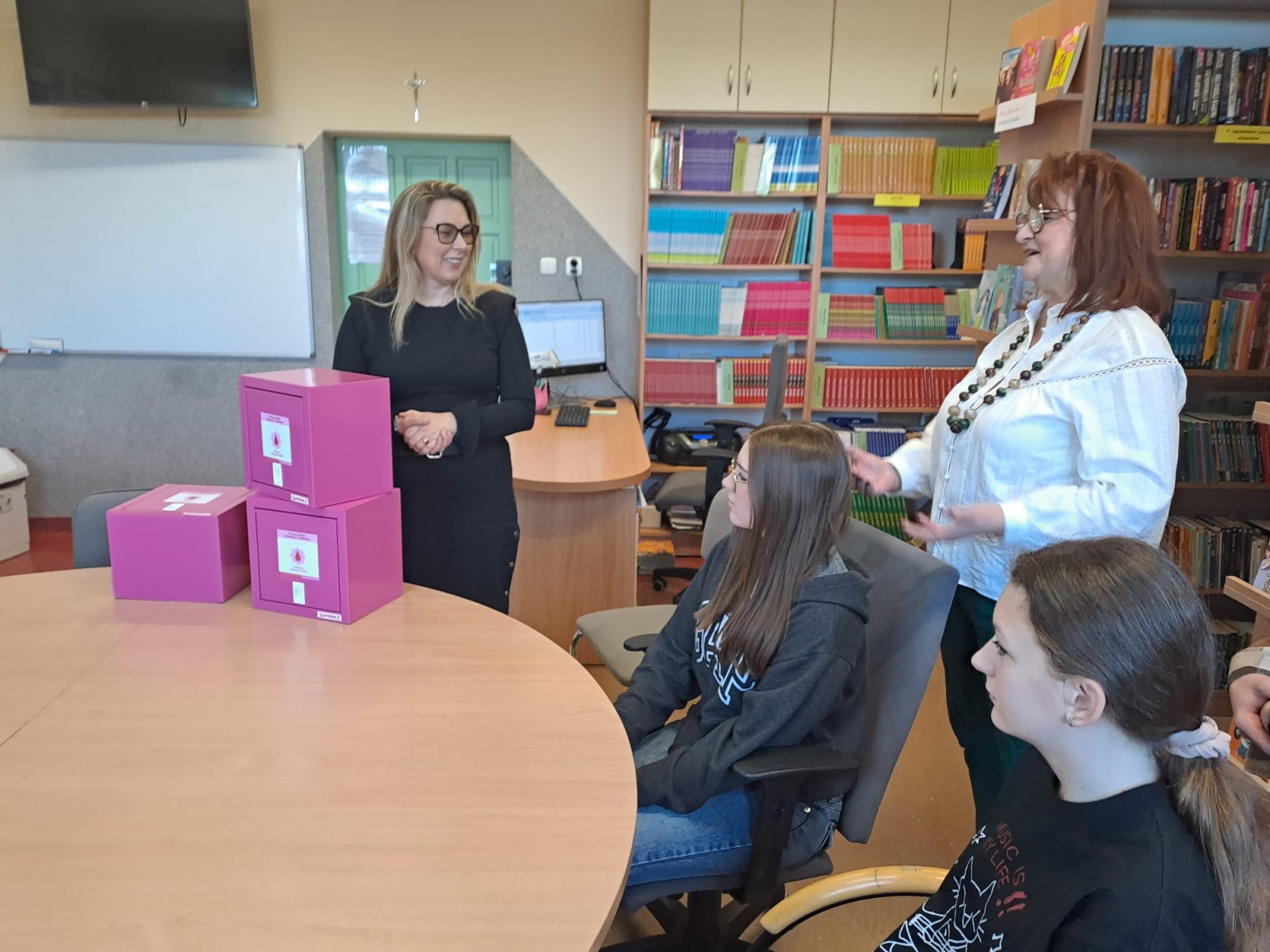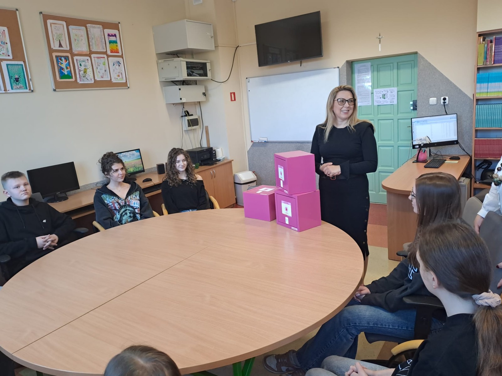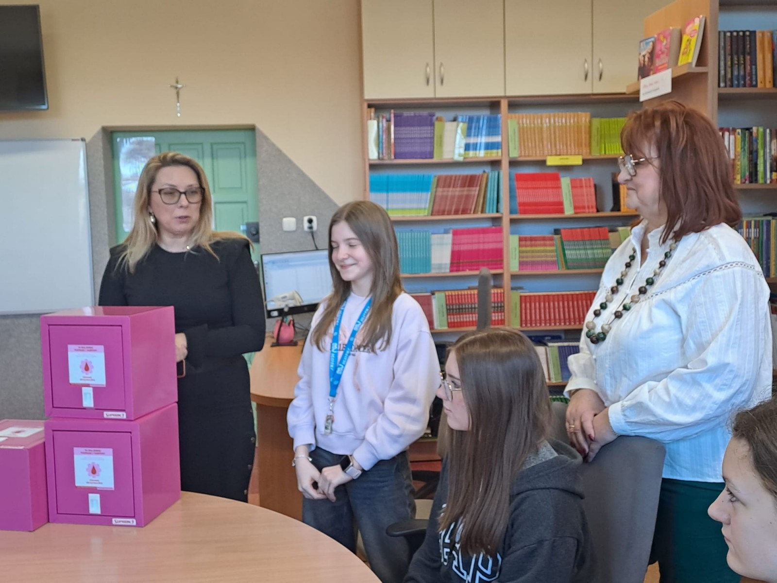W piątek (06.03.2026r.) do naszej szkoły zawitał wyjątkowy gość – pani posłanka Barbara Oliwiecka, która wraz z panią dyrektor Beatą Knop spotkała się z przedstawicielami Samorządu Uczniowskiego. Na ręce przedstawicieli uczniów przekazała ona „różowe skrzyneczki” wraz z potrzebnymi materiałami higienicznymi. Zostaną one zamontowane w łazienkach dla dziewczyn i będą systematycznie uzupełniane przez Radę Rodziców. Pomysłodawczynią tej akcji była Michalina Ślęzak z kl.5b, która dostrzegła taka potrzebę w naszej szkole.