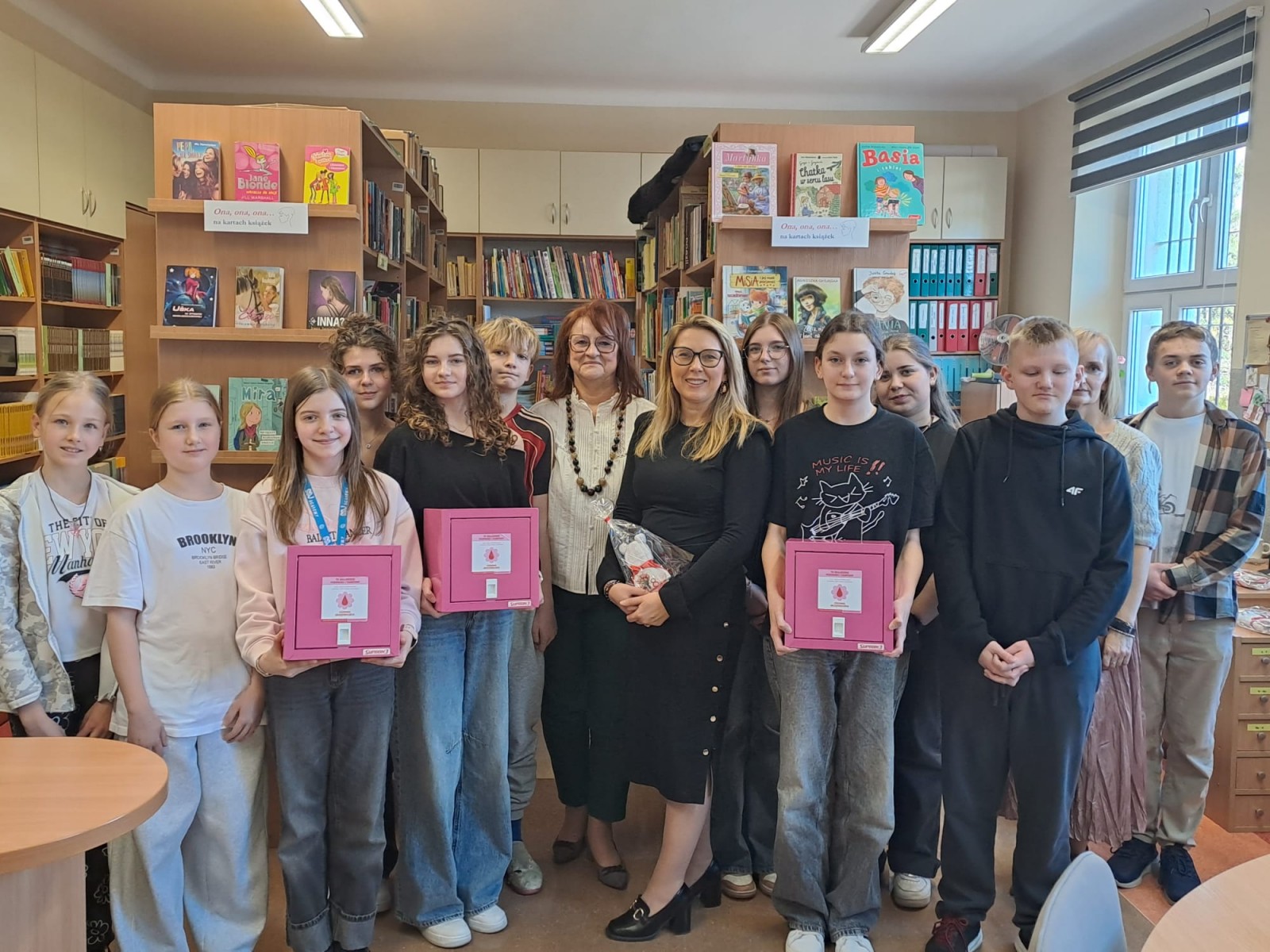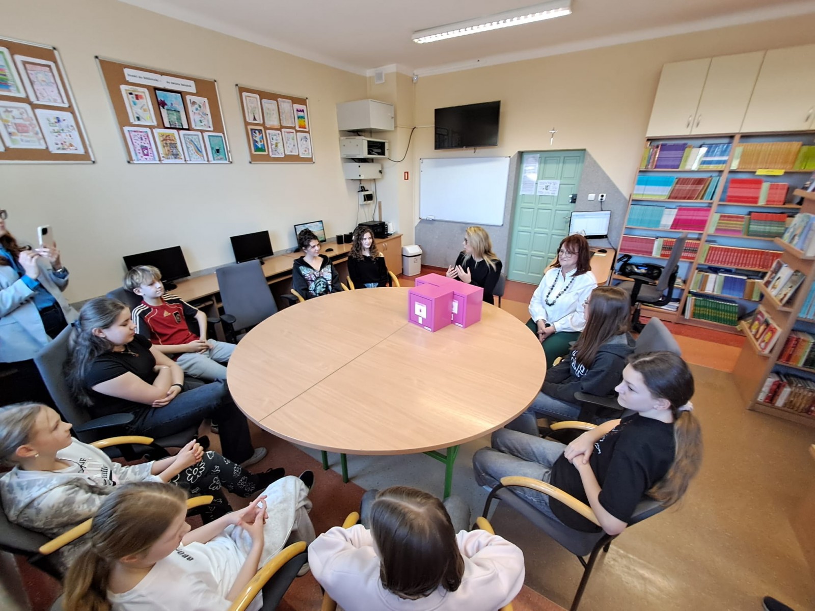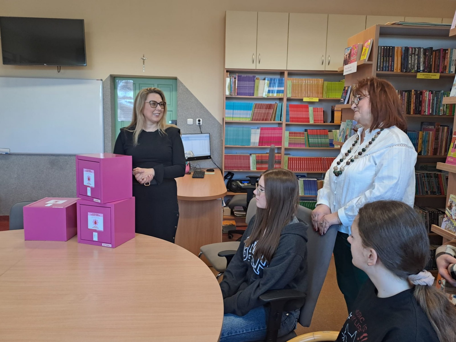 W piątek (06.03.2026r.) do naszej szkoły zawitał wyjątkowy gość – pani posłanka Barbara Oliwiecka, która wraz z panią dyrektor Beatą Knop spotkała się z przedstawicielami Samorządu Uczniowskiego. Na ręce przedstawicieli uczniów przekazała ona „różowe skrzyneczki” wraz z potrzebnymi materiałami higienicznymi. Zostaną one zamontowane w łazienkach dla dziewczyn i będą systematycznie uzupełniane przez Radę Rodziców. Pomysłodawczynią tej akcji była Michalina Ślęzak z kl.5b, która dostrzegła taka potrzebę w naszej szkole.