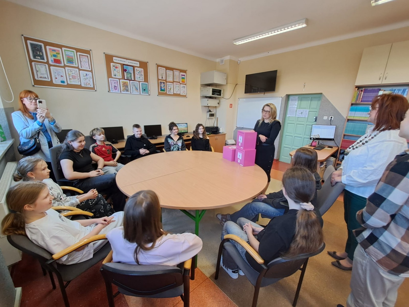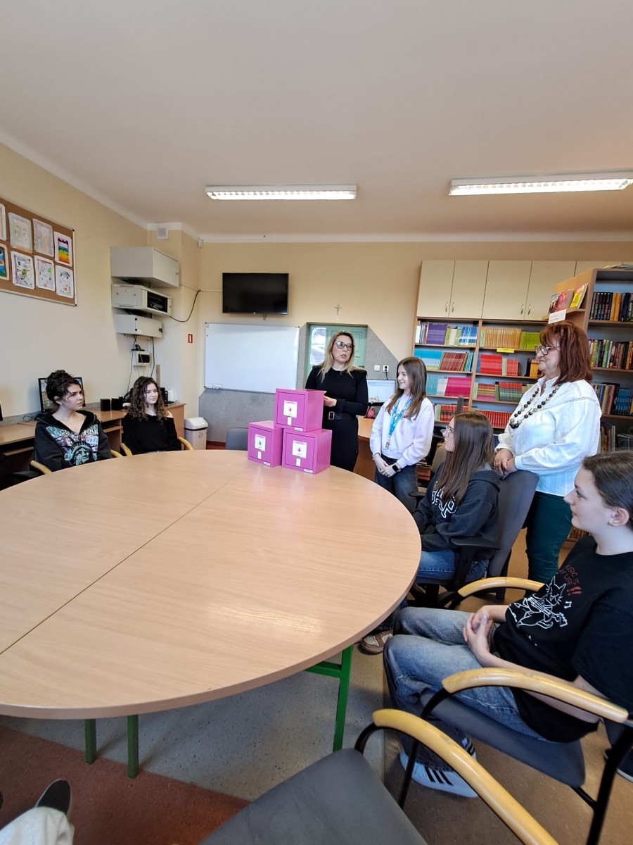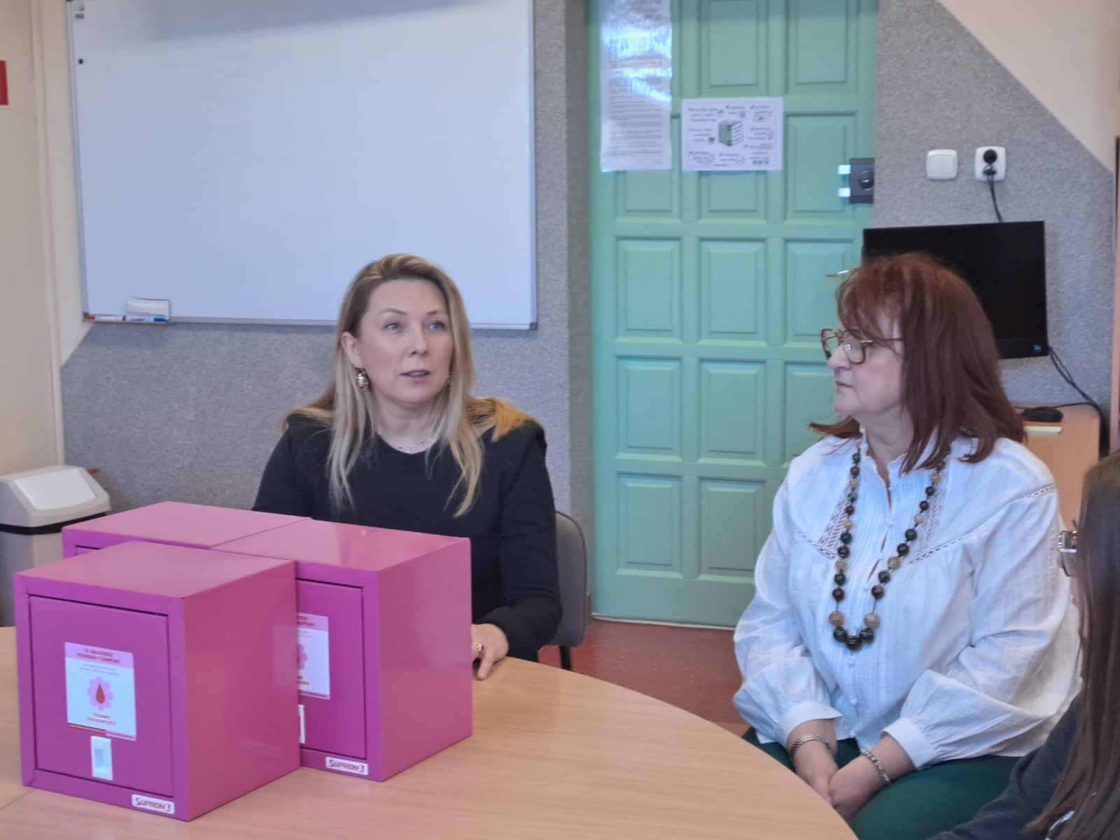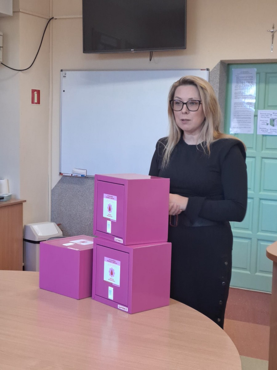 W piątek (06.03.2026r.) do naszej szkoły zawitał wyjątkowy gość – pani posłanka Barbara Oliwiecka, która wraz z panią dyrektor Beatą Knop spotkała się z przedstawicielami Samorządu Uczniowskiego. Na ręce przedstawicieli uczniów przekazała ona „różowe skrzyneczki” wraz z potrzebnymi materiałami higienicznymi. Zostaną one zamontowane w łazienkach dla dziewczyn i będą systematycznie uzupełniane przez Radę Rodziców. Pomysłodawczynią tej akcji była Michalina Ślęzak z kl.5b, która dostrzegła taka potrzebę w naszej szkole.