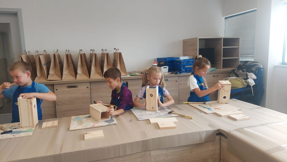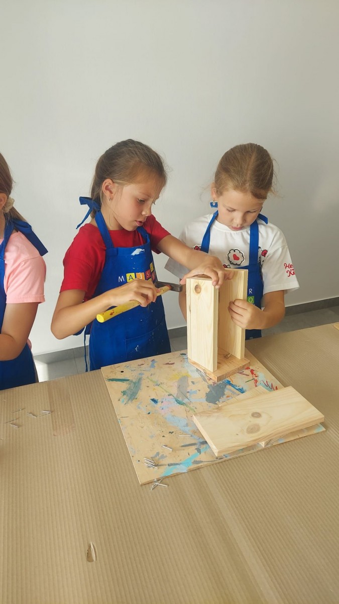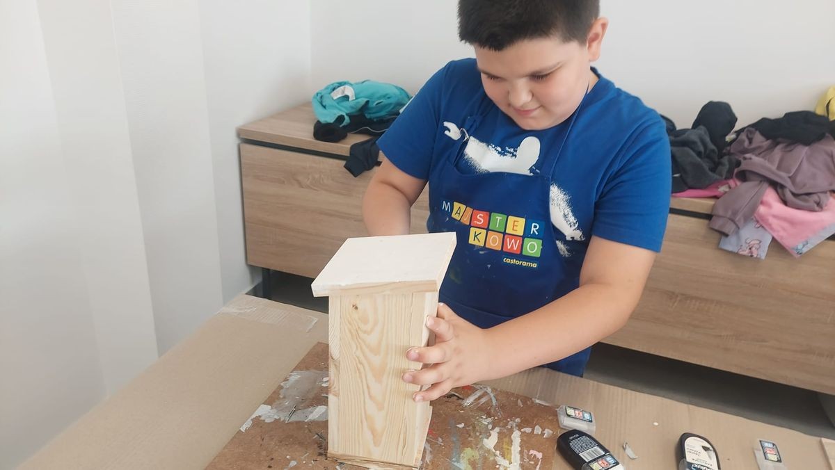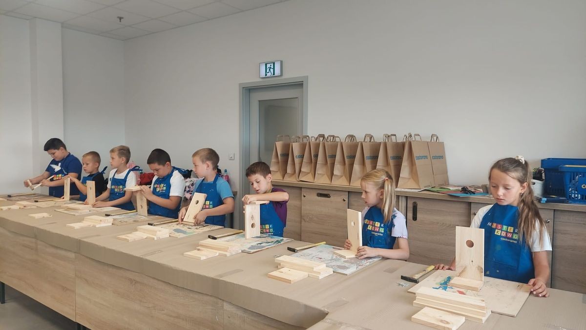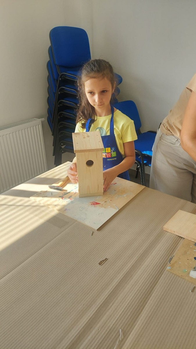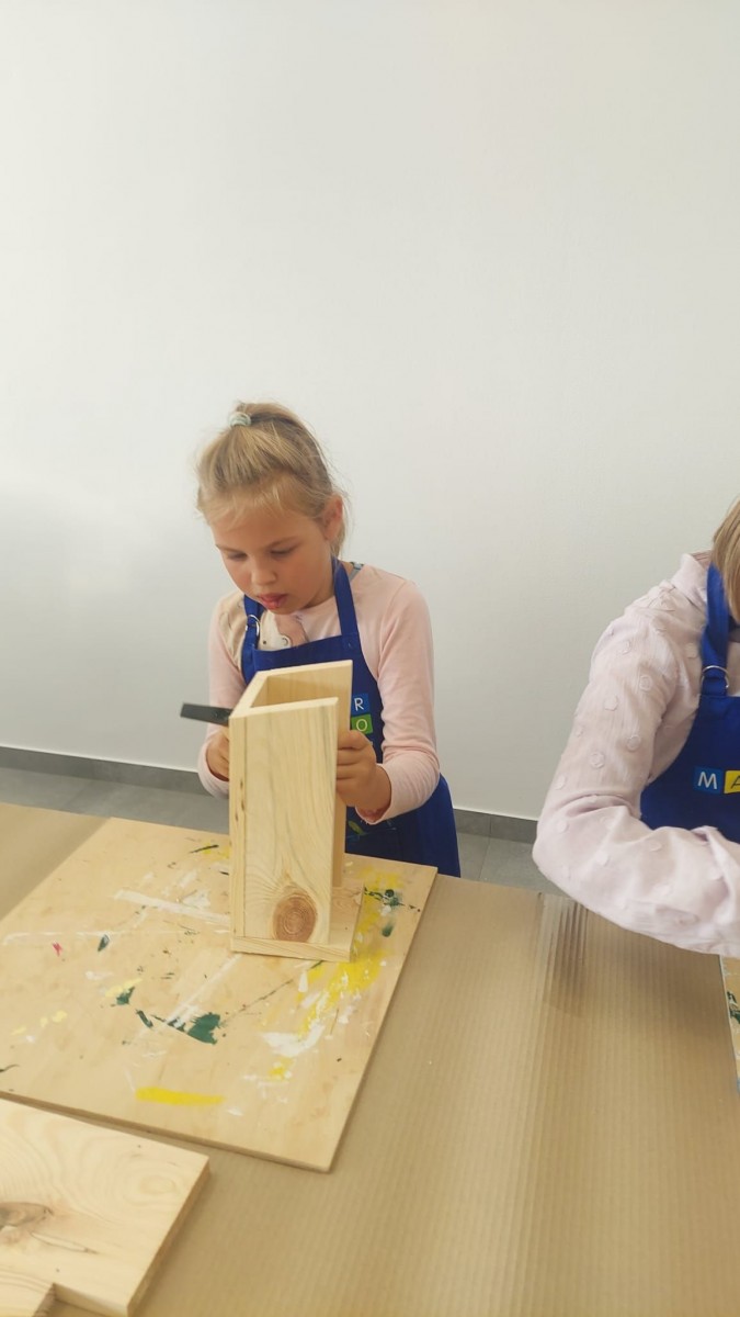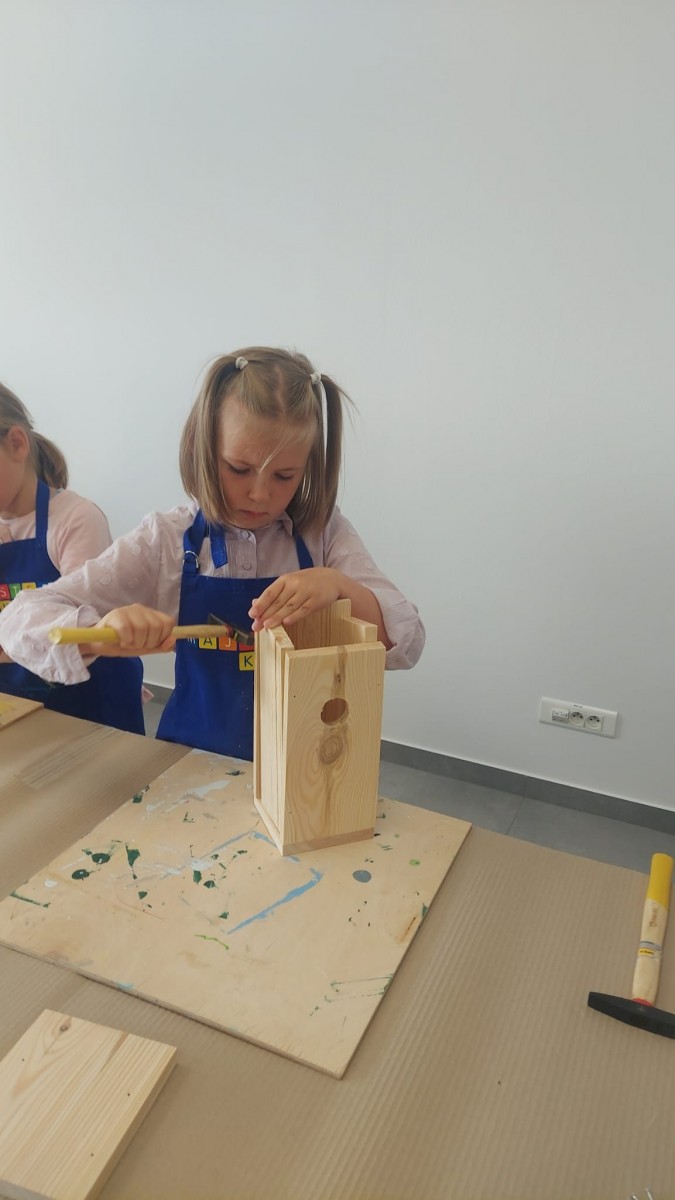 Zajęcia miały na celu rozwijanie kreatywności, zainteresowań majsterkowaniem, zdolności manualnych. Pobudzanie wyobraźni. Zwiększenie wiadomości z zakresu ekologii. Dzieci z ogromnym zaangażowaniem wykonały karmniki dla ptaków. Łączyły deseczki, wbijały gwoździe, a następnie ozdabiały, naklejały naklejki i malowały ścianki karmnika. Wszystkie prace wykonywały pod opieką p. E. Kwaśniewskiej i K. Majewskiej oraz pracowników Castoramy. Poznały główne działy sklepu Castorama.